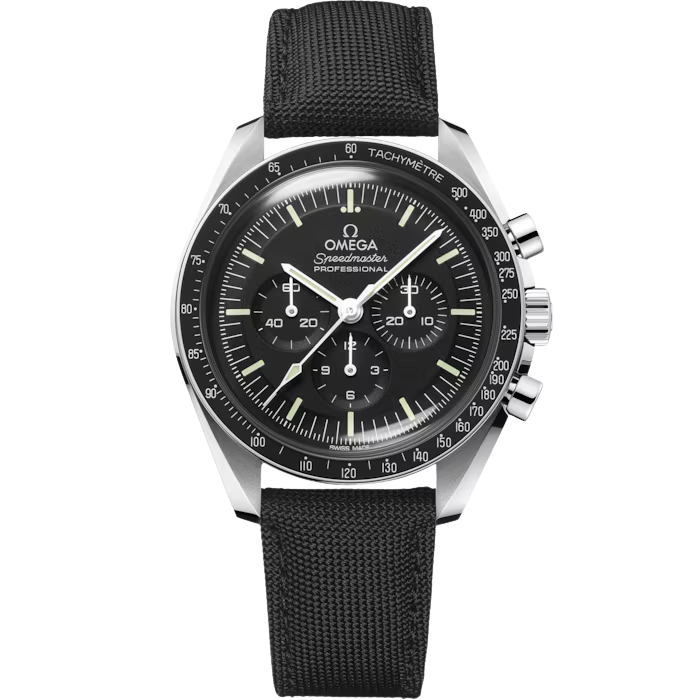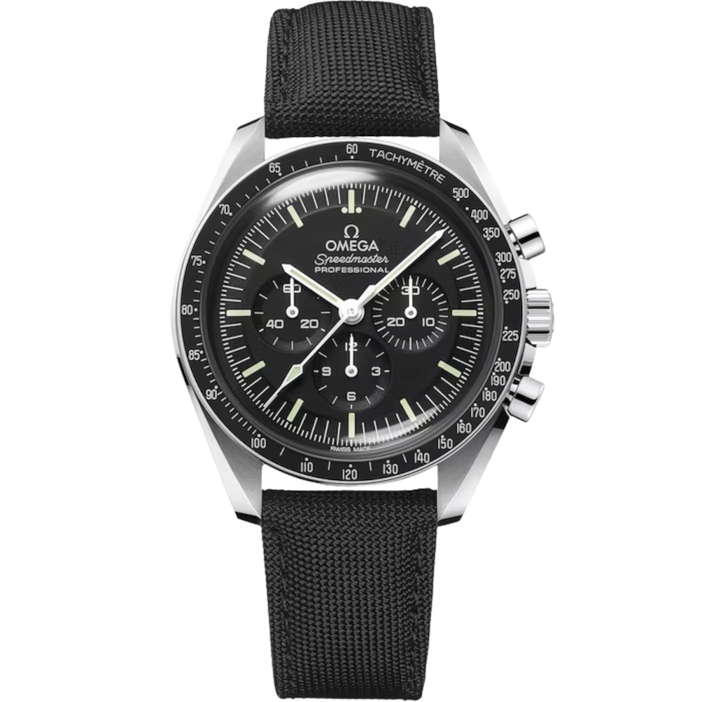 Presented on a nylon fabric strap, this 42 mm Moonwatch in stainless steel features hesalite glass on the front and an embossed Seahorse medallion on the caseback. Inspired by the 4th generation Speedmaster style worn on the moon, it also includes an asymmetrical case, black step dial and the famous dot over 90 on the anodised aluminium bezel ring.