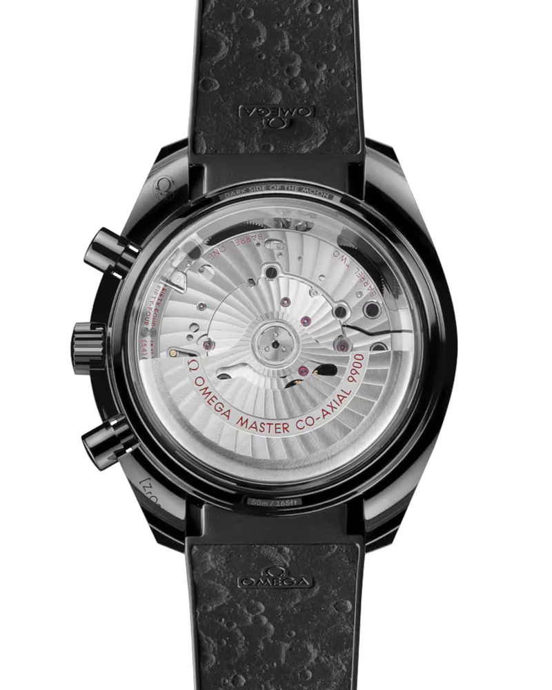The scratch-resistant sapphire crystal, treated with anti-reflective coating on both sides, protects the dial. The black rubber strap, featuring a lunar surface-inspired interior, pairs with a ceramic deployant clasp with ceramized titanium components. The watch is water-resistant to 5 bar (50 meters), with a 21 mm lug width, 50 mm lug-to-lug distance, and 15.09 mm thickness.