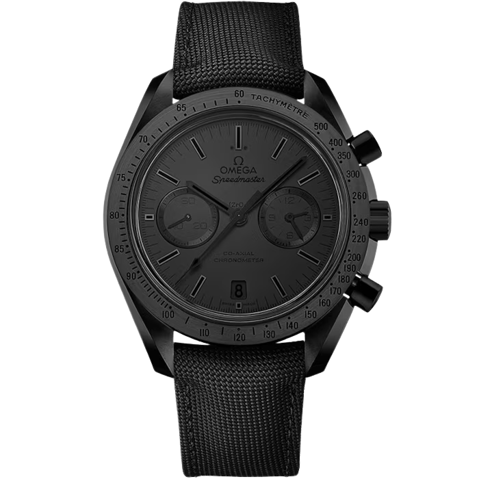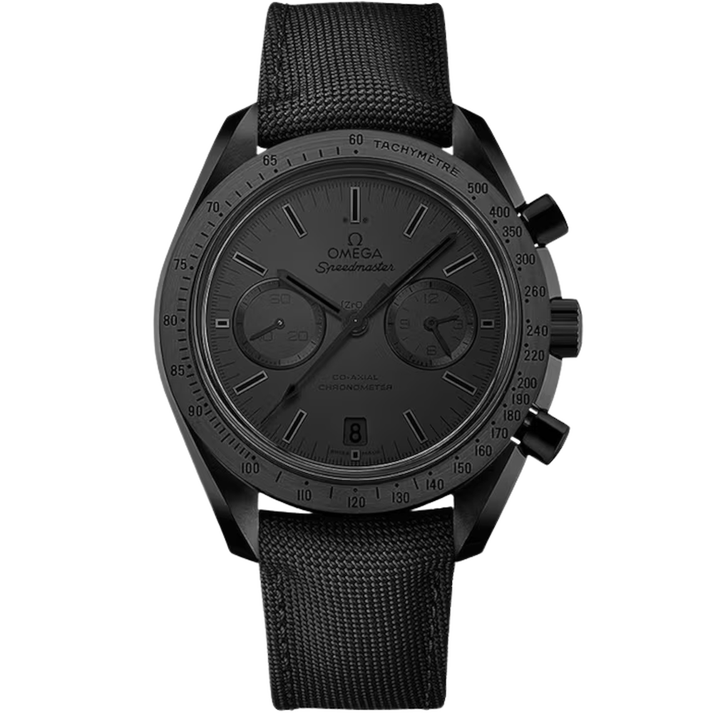 Giving this model its nickname are its brushed blackened Moonwatch-style hands and blackened applied indexes – all of which are coated with black Super-LumiNova. The familiar sub-dials at 3 and 9 o’clock are also matt black and the black ceramic bezel has a black lacquered tachymeter scale. At its heart is the OMEGA Co-Axial calibre 9300.