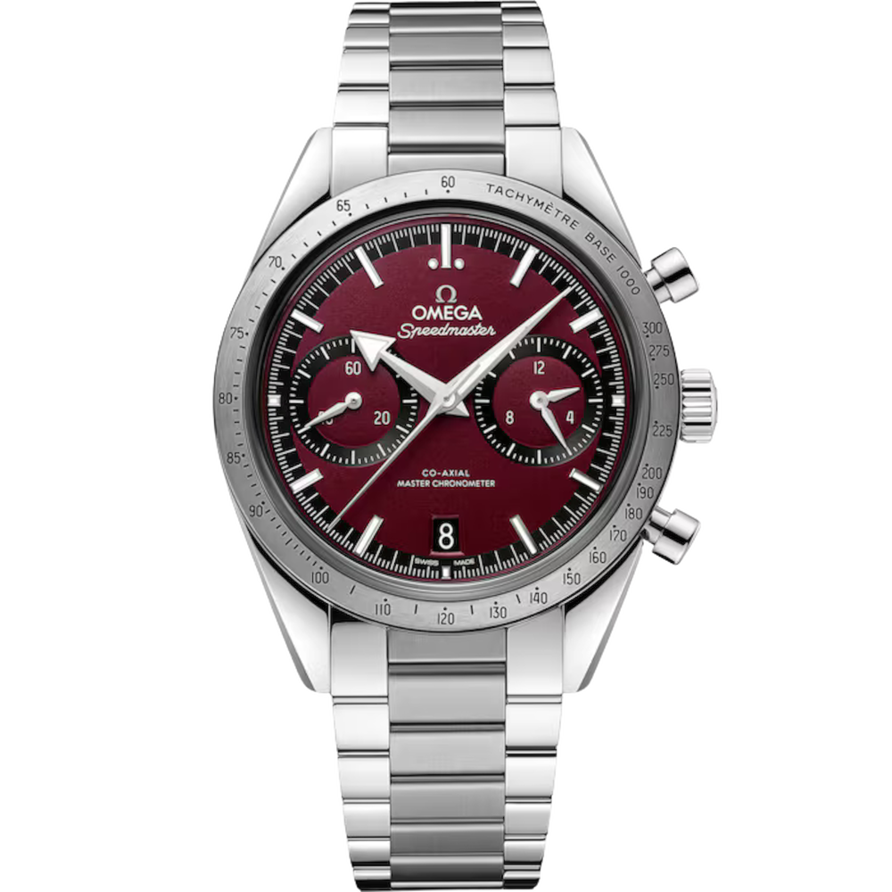 This 40.50 mm model, inspired by the legendary 1957 original, features a stainless steel case and a burgundy dial with rhodium-plated hour markers and “Broad Arrow” hands - all featuring white Super-LumiNova. There is a date window at 6 o’clock, a small seconds subdial at 9 o’clock, and 12-hour and 60-minute chronograph recorders on the subdial at 3 o’clock.