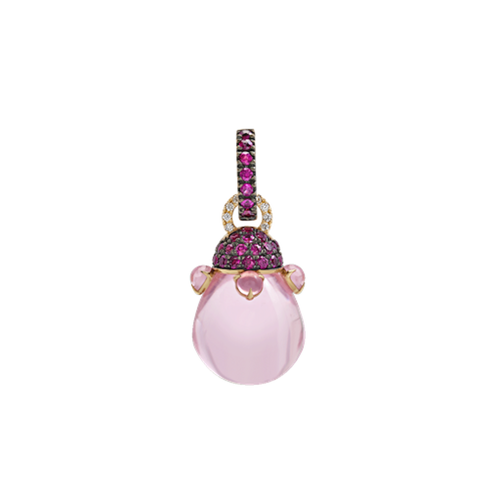 Joyful pendant in 18Kt rose gold, diamonds, pink sapphires, and pear-shaped pink crystal.