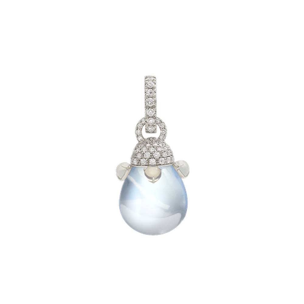 Joyful pendant in 18Kt white gold, diamonds, and milky-colored crystal poire.