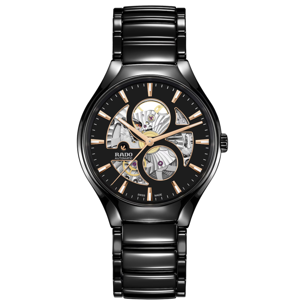 Experience the perfect blend of design excellence and material mastery with the Rado True Round Open Heart. This remarkable timepiece showcases a captivating open heart design, allowing you to admire the intricate movements of the automatic Rado caliber R734, a pure expression of the art of watchmaking. Fitted with an antimagnetic Nivachron™ hairspring, it delivers a power reserve of 80 hours. It has a polished black high-tech ceramic monobloc case and crown and a black PVD-coated titanium case whose sapphire crystal allows an unobstructed view of the movement. It features a black sunray dial with rose gold-colored bevels and a gray printed minute track. Fittingly, this study in black is delivered on a polished black high-tech ceramic bracelet with a titanium 3-fold clasp. The watch is water-resistant down to 50 m. The Rado True Round Open Heart is drawn to watches that are relentlessly contemporary, but which also have a timelessness and style that make them true keepsakes.