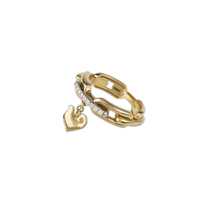Chain-link ring with a dangling rooster charm in yellow gold and diamonds.