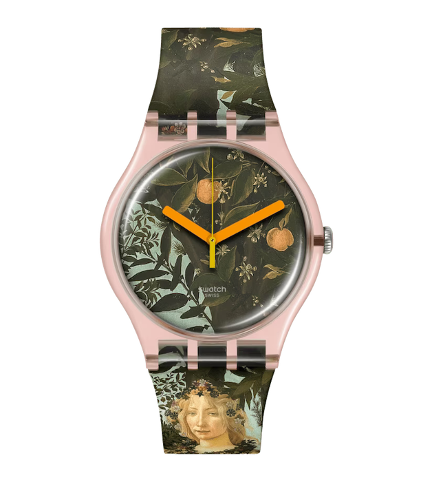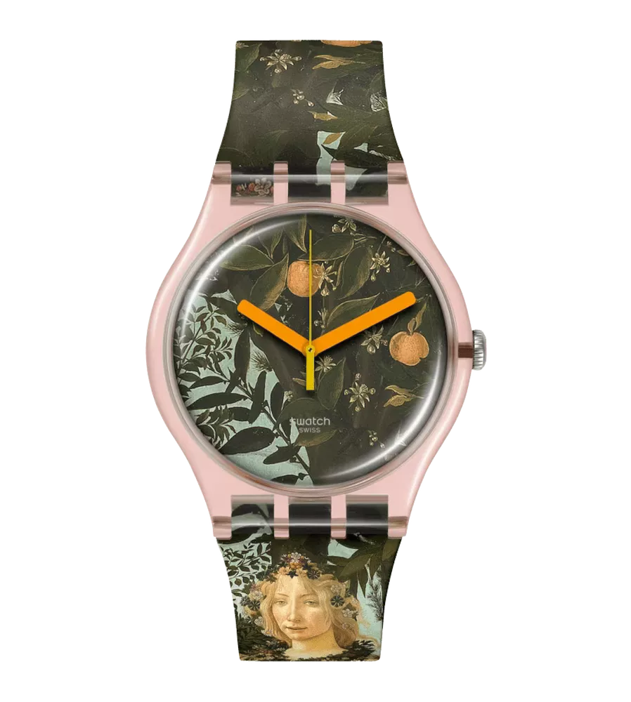 ALLEGORY OF SPRING BY SANDRO BOTTICELLI depicts the work of the same name by Renaissance artist Sandro Botticelli, printed in continuum on the front of the multicolored strap and dial. The light pink transparent case and matte pink inner part of the strap help to highlight the romantic aura of the work. The wording "THE OFFICE GALLERIES" is engraved on the loop. Botticelli, Allegory of Spring, Uffizi Gallery - "By permission of the Ministry of Culture - Gallerie degli Uffizi""