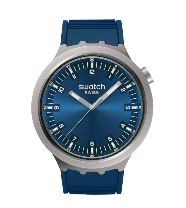 This oversize watch features a sun-brushed navy blue dial with glow-in-the dark indexes, white printed numerals and minute track, silver-colored hour and minute hands with glow-in-the-dark effect and a silver-colored seconds hand. The sandblasted stainless steel case and bezel are contrasted by the structured navy blue strap with matching loops and a sandblasted stainless steel half-buckle.