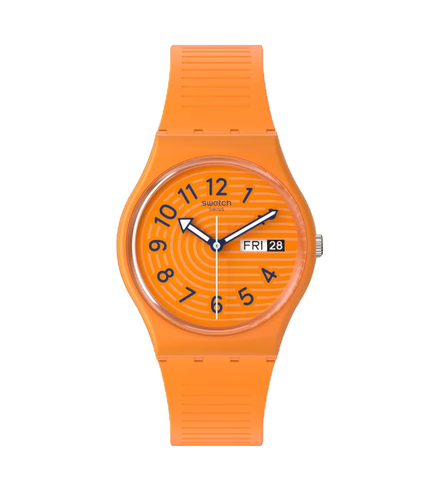 The dial of this orange watch features printed dark blue numerals and a dark orange texture in a case with biosourced glass. Glow-in-the-dark hands indicate the time, and the date window is at 3 o'clock. The matching orange strap, loop, and buckle create a beautiful tone-on-tone combination.