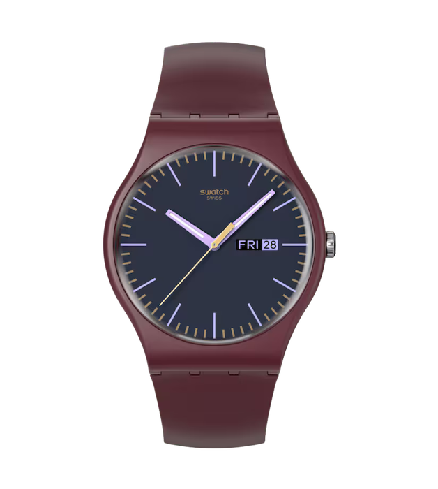 The dark brown dial of this timepiece features light purple hour markers, a light brown minute track, and a date window at 3 o'clock. Light purple hour and minute hands that glow in the dark and a rose gold-colored seconds hand show the time behind the biosourced crystal. Completing the watch is a matte burgundy biosourced case with matching biosourced strap, loop, and buckle.