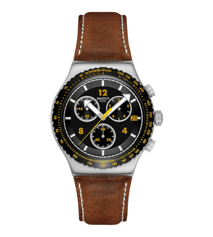 Questo cronografo in acciaio inossidabile presenta un quadrante nero spazzolato soleil con numeri stampati in giallo, indici che si illuminano al buio e datario giallo con stampa nera a ore 3. Lancette di ore e minuti argentate a forma di freccia che si illumina al buio e una lancetta gialla dei secondi cronografici indicano l'ora. Ha una cassa in acciaio inossidabile spazzolato e una lunetta con rivestimento in PVD nero e scala tachimetrica stampata in giallo. Completano l’orologio il cinturino in pelle marrone con cuciture a contrasto, i passanti in pelle marrone e la mezza fibbia in acciaio inossidabile spazzolato.