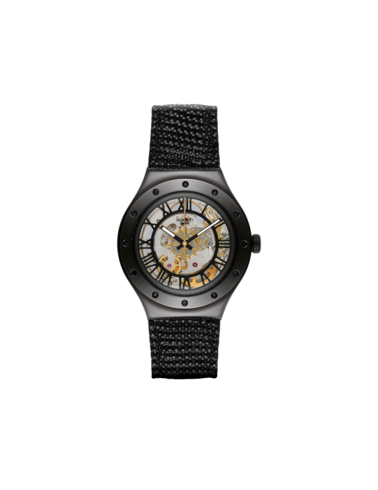 This attractive men's Swatch Rosetta Nera watch has a black ion-plated steel case and is powered by an automatic movement. It is fitted with a black fabric strap and has a black dial.