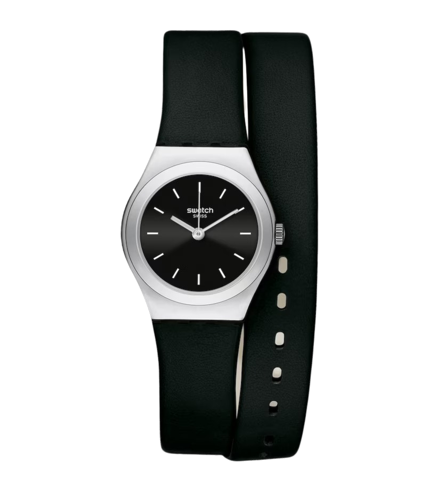 Swatch Irony Lady con cassa in acciaio lucido e quadrante nero con indici argentati. Il cinturino è in pelle nera extra lungo, per permettere di essere indossato a doppio giro sul polso, con fibbia in acciaio.