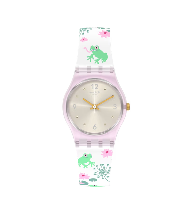 ENCHANTED POND (LP160) comes straight out of a fairytale with dainty blossoms and frogs that might be princes in disguise. Glittering golden Swatch Sparkles adorn the silvery dial.