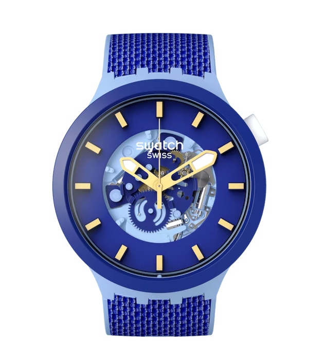 This pastel blue BIG BOLD BIOSOURCED oversize watch features a midnight blue cut-out dial with a beige print that glows in the dark. The plain matte blue silicone strap is decorated with a fabric insert, also midnight blue. The glass, bezel, and case of this big face watch are all made of biosourced material.