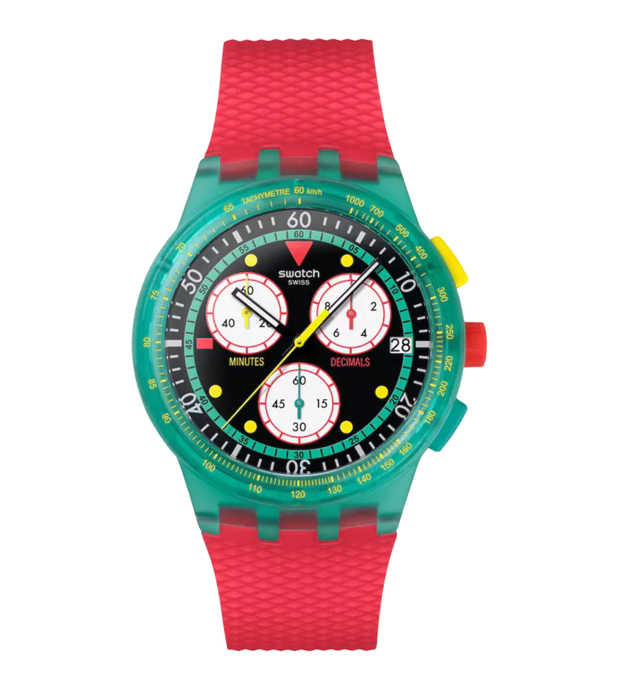 Inspired by a classic 1980s Swatch GENT, this retro-style chronograph reinterprets the original design of the iconic collector’s piece EMERALD DIVER (GG703). The colorful dial features black hour and minute hands that glow in the dark, a vibrant yellow chronograph second hand, and a date display at 3 o'clock, blending function with vintage charm. The matte transparent green case is paired with a matching bezel printed with a yellow tachymeter scale, adding a bold and dynamic contrast. Completing the design is a matte red textured silicone strap, finished with a transparent matte green polymer loop and buckle. With a case diameter of 42 mm, a thickness of 14.03 mm, and a lug-to-lug height of 50.10 mm, it offers a bold yet comfortable fit on the wrist. Part of the ORIGINALS collection, this timepiece blends nostalgic aesthetics with modern performance, perfect for those who appreciate bold style and iconic Swatch design.