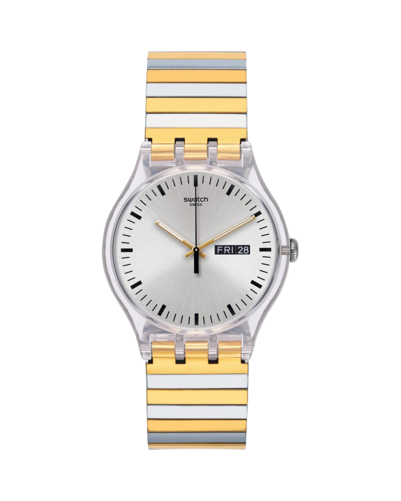 The Swatch New Gent DISTINGUO is a beautiful watch from Swatch's Ramadan collection. It first appeared in late summer 2016 only in mainly Muslim countries in the Middle East and Asia. This popular model has now also been available in Germany since January. The watch has a clear, silver-colored dial with a date display at the three o'clock position. The bi-color flex bracelet is available in two lengths, but can also be individually shortened. The bar indices are created in contrasting black. The water-resistant watch is fitted with an accurate quartz movement with battery.