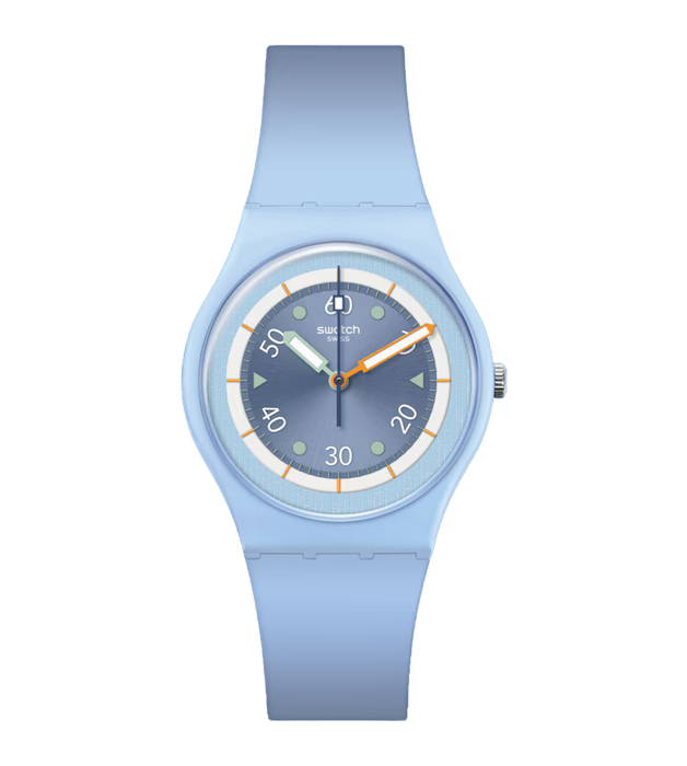 This blue-toned watch features a blue dial with white, orange and green prints and phosphorescent details. The BIOCERAMIC case is light blue with biosourced glass. The green hour hand, orange minute hand and blue second hand glow in the dark. The matte green loop on the matte gradient blue strap highlights the details of the watch's dial.