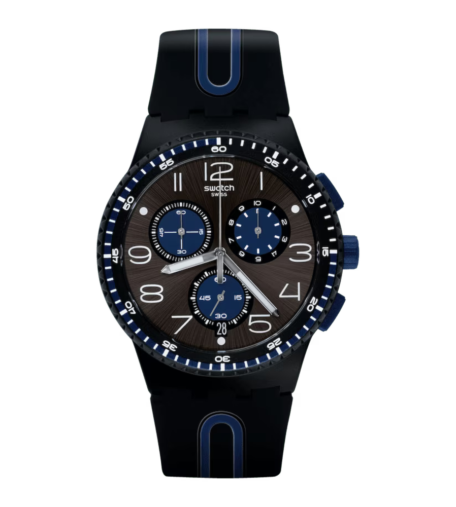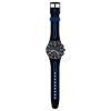 The KAICCO (SUSB406) watch stands out for its sun-brushed black dial with white, blue and black prints, and for its numerical indices. Three subdials and the date display at 6 o'clock make it functional and modern. The bezel is made in intense matte black with multicolored prints, the case in matte black. The black strap is enhanced by bright blue elements for a graphic effect of the fabric.