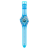 The transparent blue dial of this diving watch features white printed indexes and numerals, blue hour and minute hands, and a grey seconds hand — all of which glow in the dark — under a biosourced glass. The case combines matte white Bioceramic with glossy transparent blue biosourced material and is paired with a glossy transparent blue biosourced bezel featuring grey and white print that glows in the dark. A matte white Bioceramic crown is positioned at 10 o’clock. Completing the design is a matte white and matte transparent blue strap with a matte transparent blue loop and a glossy transparent blue biosourced pin buckle.