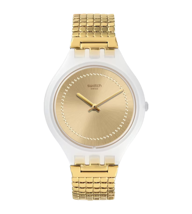 One look at the SKINGLANCE (SVOW104G) is enough to get your heart racing. With an ultra-thin, low-profile Swatch case, this golden model features a sun-brushed silver dial with golden Swatch Sparkles and a golden print. The 36.8mm double-injected case is divided along a curved line, and the look is completed with an adjustable polished stainless steel bracelet with gold PVD.
