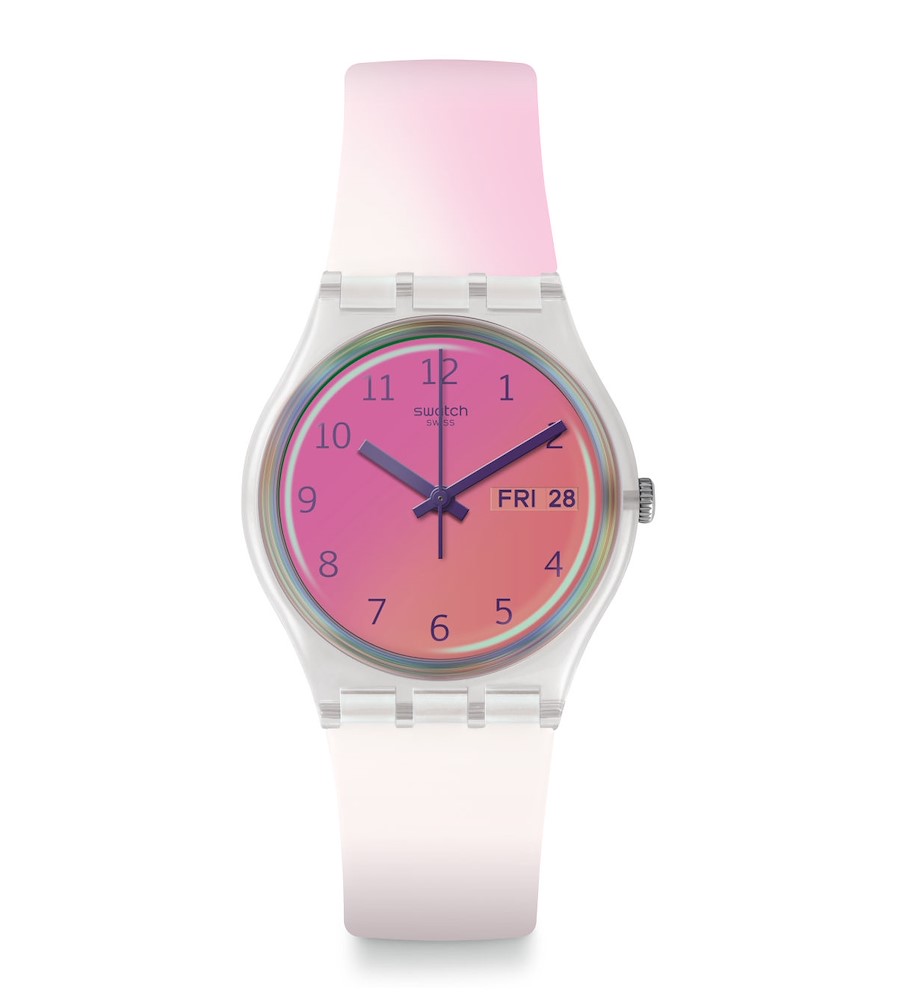 Furiously fashionable ULTRAFUSHIA (GE719) has an enchanting Swatch Solar Spectrum Glass that covers its pink dial. Blue print and blue hands give this watch extra verve.
