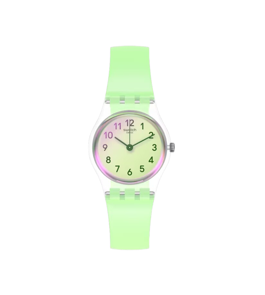 CASUAL GREEN (LK397) has a relaxed style with an added twist. The green and pink Swatch Solar Spectrum glass looks different from every angle.