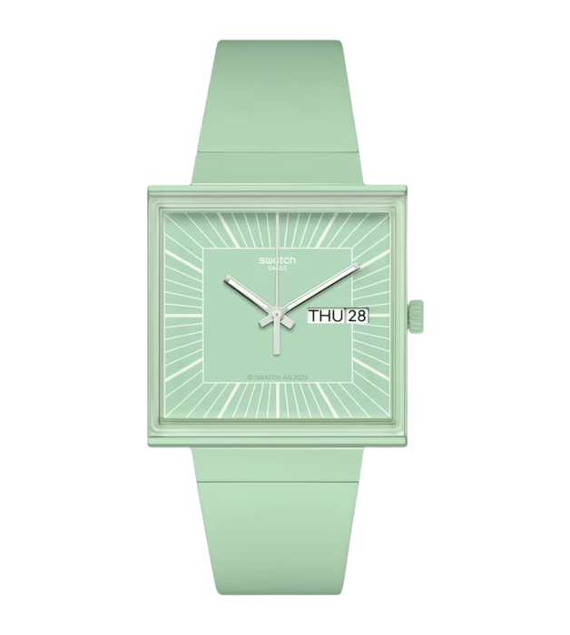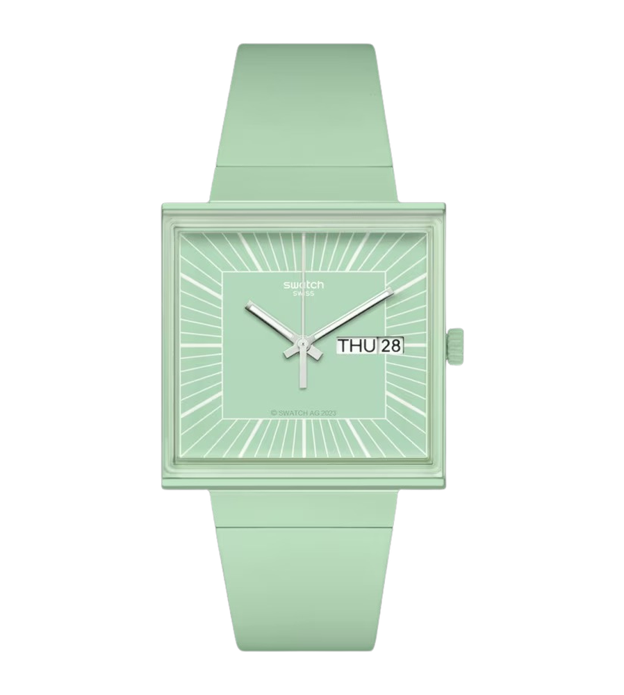 The square case of this mint green BIOCERAMIC watch features edge-to-edge biosourced glass that allows a side view of the watch's printed white indexes. The square dial features phosphorescent silver hands and a date window at the 3 o'clock position. The dial is complemented by an integrated biosourced strap with BIOCERAMIC buckle. The battery cover printed on the back depicts a view of the watch face.