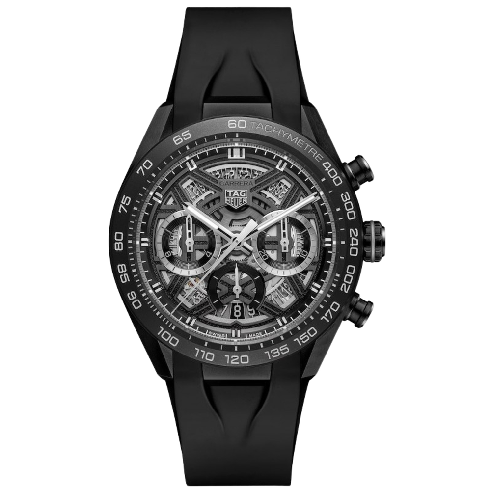 Immerse yourself in the essence of motorsport with this striking 44mm TAG Heuer Carrera Chronograph. Dressed entirely in black, it strikes a bold statement of elegance and power, designed for those who live and breathe the thrill of the race.