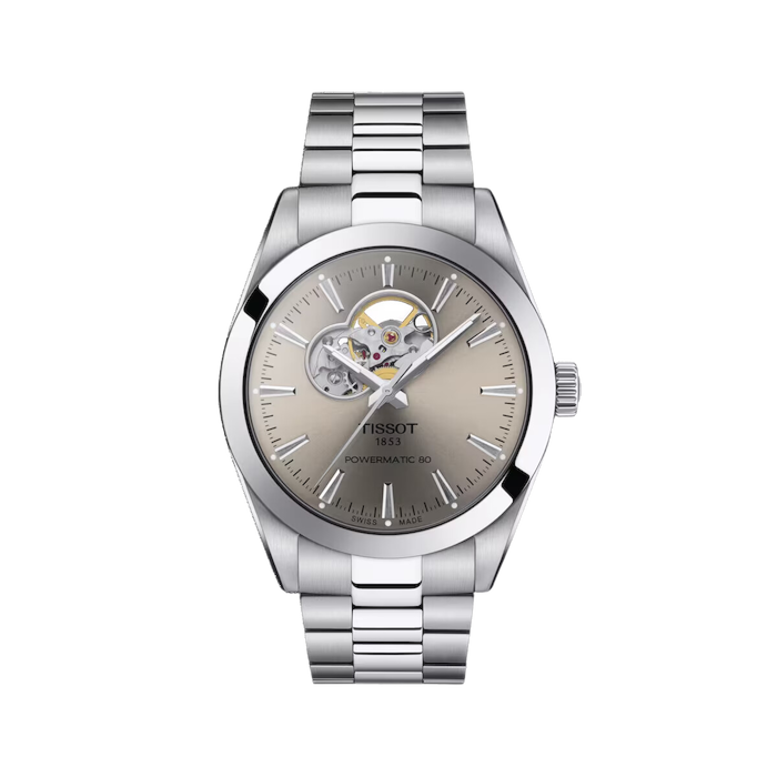 The Tissot Gentleman Powermatic Open Heart is an elegant watch, featuring a new and contemporary open heart design. Its strong curved horns are an harmonious continuation of the watch, favouring a pleasant wear around the wrist. This eye-catching design is a symbol of Swiss Made watchmaking tradition, and is a strong visual reminder of Tissot’s heritage due to the beauty of the movement beneath it. Discover this chic and elegant version with its rhodium-grey dial and stainless steel bracelet.