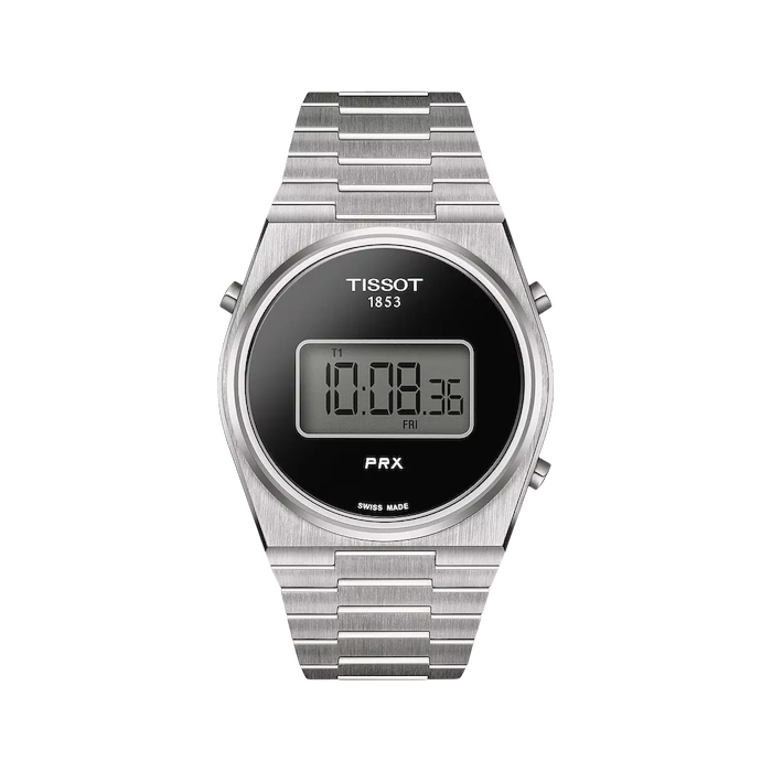The Tissot PRX Digital, a harmonious blend of the iconic 1978 PRX design and the Tissot Digital Quartz (Calibre 4012), brilliantly exhibits a hybrid of past eras and digital influence. Seamlessly blending retro aesthetics with a contemporary twist, it is the timekeeper for trailblazers of today. The PRX Digital, available in 35mm and 40mm options and in a variety of colours, cater to all wrists, while the multitude of features - dual time zones, day-date, chronograph, and more - cater to all needs. Encased in a shell water-resistant up to 100 metres and fastened with a satin-finish bracelet and a triple-blade folding clasp, these timepieces are crafted for both endurance and comfort. The Tissot PRX Digital collection symbolises a journey through time, a tribute to the past and a toast to the future. Discover this 35mm version with its black dial and stainless steel bracelet for a vintage and elevated look.