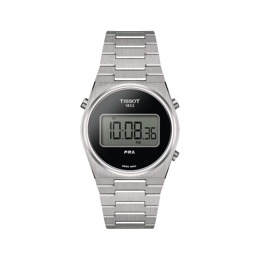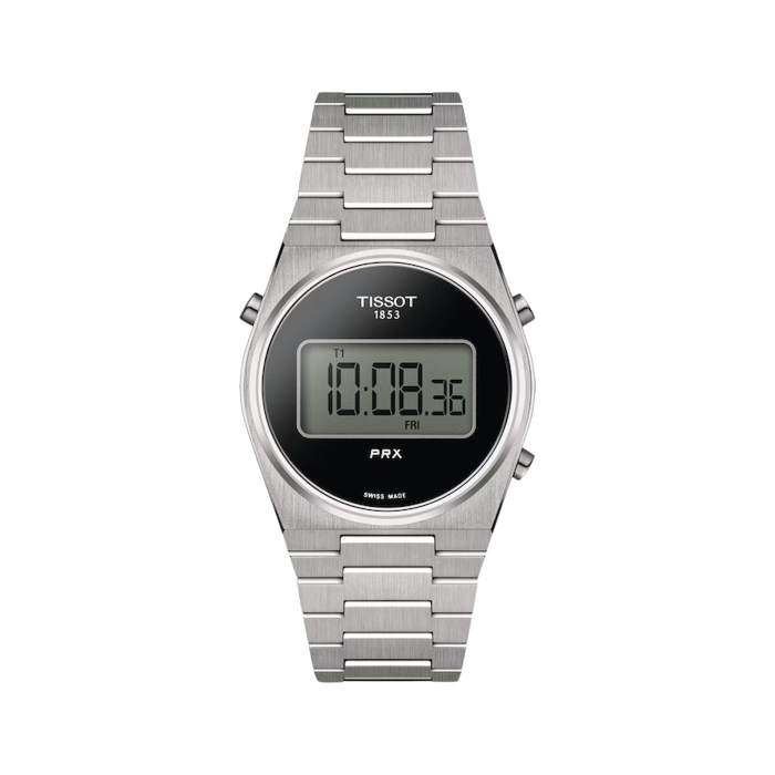 The Tissot PRX Digital, a harmonious blend of the iconic 1978 PRX design and the Tissot Digital Quartz (Calibre 4012), brilliantly exhibits a hybrid of past eras and digital influence. Seamlessly blending retro aesthetics with a contemporary twist, it is the timekeeper for trailblazers of today. The PRX Digital, available in 35mm and 40mm options and in a variety of colours, cater to all wrists, while the multitude of features - dual time zones, day-date, chronograph, and more - cater to all needs. Encased in a shell water-resistant up to 100 metres and fastened with a satin-finish bracelet and a triple-blade folding clasp, these timepieces are crafted for both endurance and comfort. The Tissot PRX Digital collection symbolises a journey through time, a tribute to the past and a toast to the future. Discover this 40mm version with its black dial and stainless steel bracelet for a vintage and elevated look.