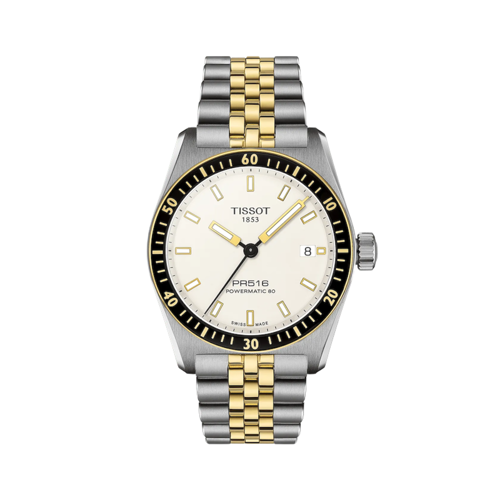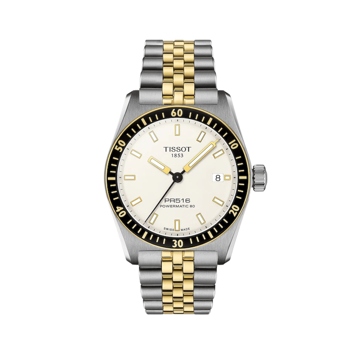 This 38mm watch features a sleek stainless steel case and a sporty dial, embodying the spirit of speed and precision. Powered by a Powermatic 80 movement, the new PR516 Powermatic 80 offers unmatched accuracy for an active lifestyle. Super-LumiNova®️-coated indexes ensure visibility in all conditions. The versatile design of this sporty watch is complemented by a quick interchangeable bracelet system, perfect for transitioning from business meetings to casual outings. This PR516 Powermatic is a modern classic, showcasing Tissot’s rich heritage with its cream dial and two-toned stainless steel and gold PVD bracelet.
