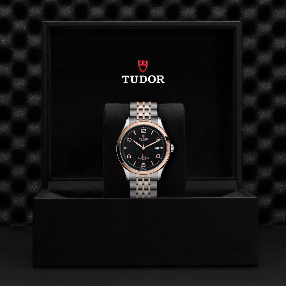 The TUDOR watch reference M91651-0003 features a 41 mm polished steel case with a thickness of 9.3 mm, paired with a smooth bezel coated with a 0.3 mm layer of polished rose gold. The domed black dial with embossed decoration features gold hour markers and hands, as well as a date window at 3 o'clock, and is protected by sapphire crystal. The timepiece is powered by the T601 self-winding mechanical movement, with a power reserve of approximately 38 hours, and is equipped with a screw-down steel winding crown with the TUDOR logo embossed on it, ensuring water resistance to 100 meters. The bracelet is made with the first central links in steel or solid rose gold and the remaining central links in steel or steel coated with a 0.2 mm layer of rose gold, completing an elegant and distinctive watch covered by a five-year transferable warranty without the need for registration or mandatory servicing.