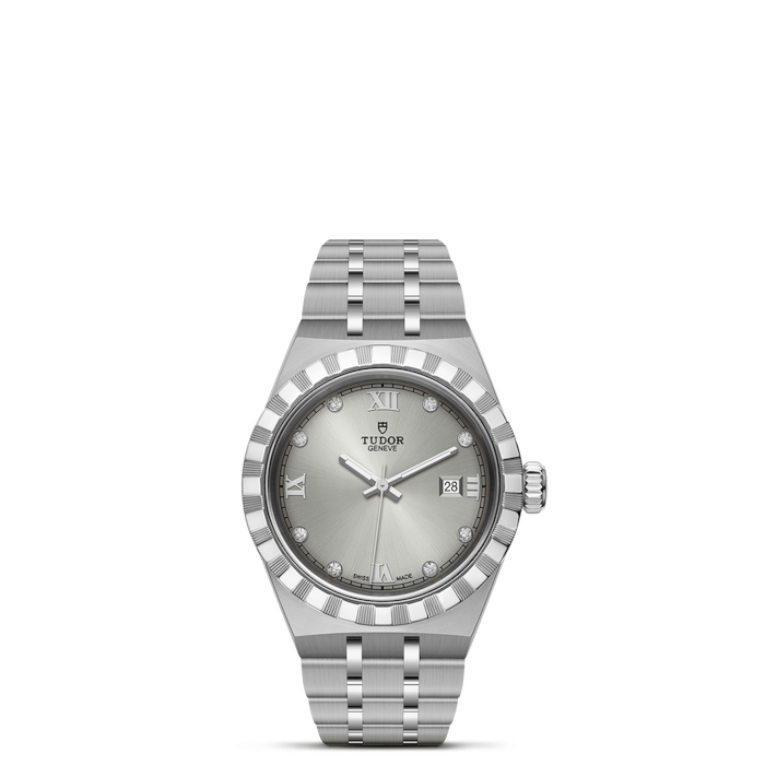 Dial: Silver-toned with a sunray finish, the dial is adorned with diamonds and features applied Roman numerals and a date window at 3 o'clock for added functionality.