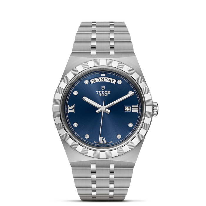 Dial: The blue dial, with a soleil finish and inset diamonds, is enriched with a day of the week indicator at 12 o'clock and a date window at 3 o'clock, offering additional functionality alongside elegance.