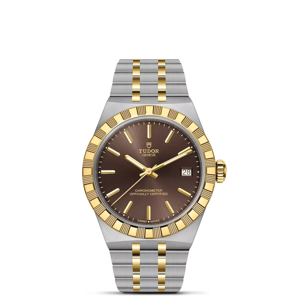 36 mm watch from the Royal collection, featuring a stainless steel and yellow gold case with polished and satin finishes. The brown dial with applied baton markers delivers a warm and sophisticated elegance, with a date display at 3 o’clock for functional and immediate readability. Powered by a COSC-certified in-house automatic movement, it offers approximately 70 hours of power reserve and water resistance up to 100 meters. The two-tone integrated steel and gold bracelet with TUDOR “T-fit” clasp completes a precious and distinctive design.