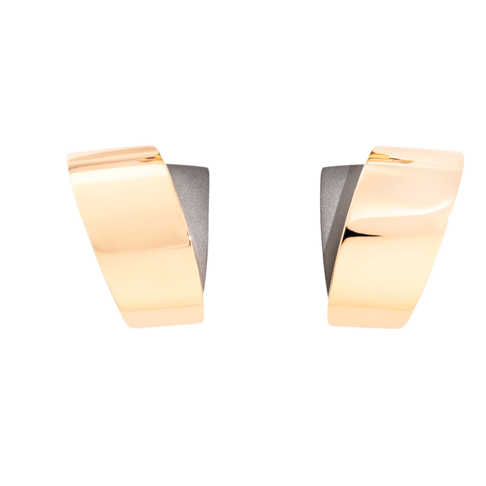 These earrings take up the design of the Tourbillon ring and are made up of two large bands, one in rose gold and one in titanium, which overlap in a dynamic composition.
