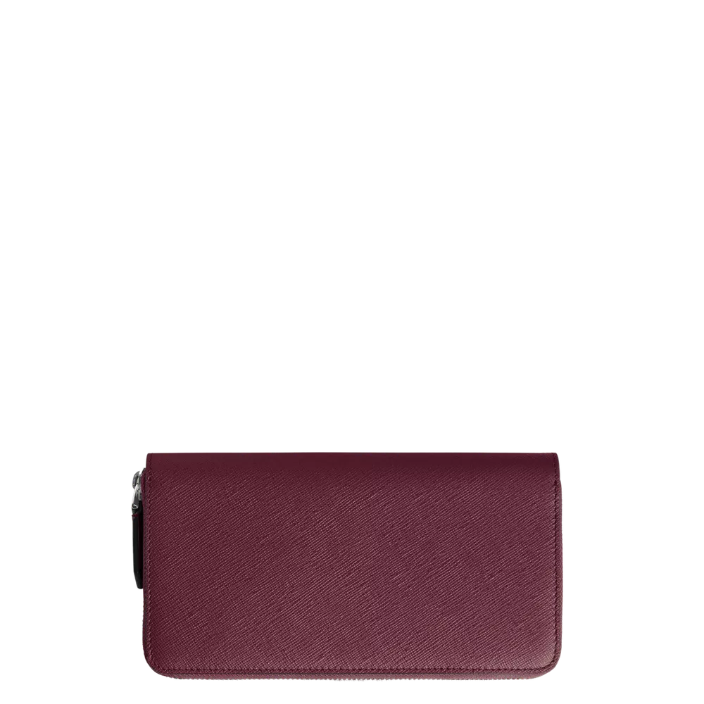 This wallet in cassis Saffiano-printed leather is a versatile accessory with numerous functional details. In addition to 12 credit card slots, it features three bill compartments, a zippered coin pocket, and three additional pockets for other small items.