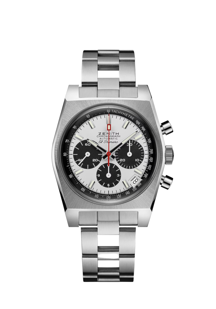 Paired with a “ladder” effect steel bracelet, the CHRONOMASTER El Primero A384 Revival is a faithful reproduction of the very first steel ZENITH watch equipped with the El Primero high-frequency automatic chronograph caliber from 1969. The tonneau-shaped case and “panda” dial are recreated following the original production designs.