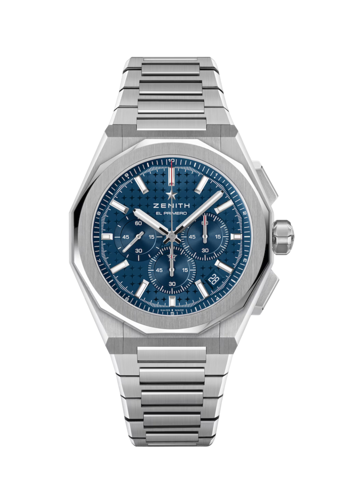 The DEFY Skyline chronograph with a 42 mm steel octagonal case and faceted bezel is distinguished by its blue “soleil” effect dial, inspired by ZENITH's emblematic four-pointed star. Animated by the El Primero 3600 high-frequency manufacture automatic movement equipped with the very first indicator with precision to 1/10th of a second. Interchangeable steel bracelet and blue rubber strap with motif inspired by the iconic ZENITH star.