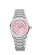 The DEFY Skyline watch with its 36mm steel octagonal case and faceted diamond-studded bezel is distinguished by its metallic pastel pink “Soleil” effect dial, inspired by ZENITH's emblematic four-pointed star. Animated by the Elite 670 automatic manufacture movement. Interchangeable steel bracelet and pink rubber strap with motif inspired by the iconic ZENITH star. The watch comes with a second strap to fully experience its interchangeability.