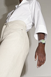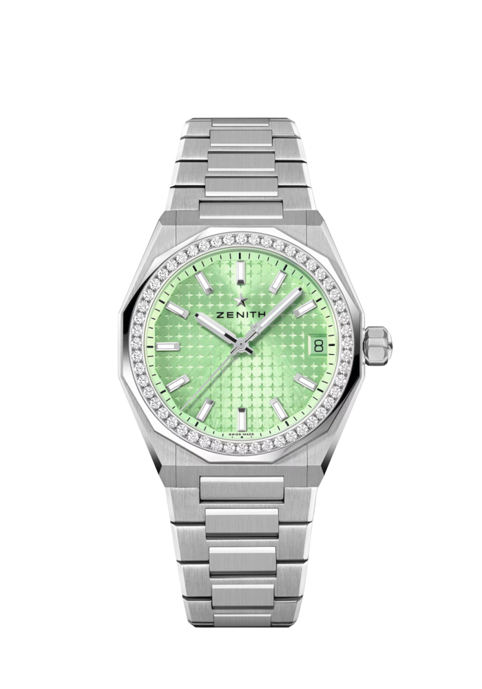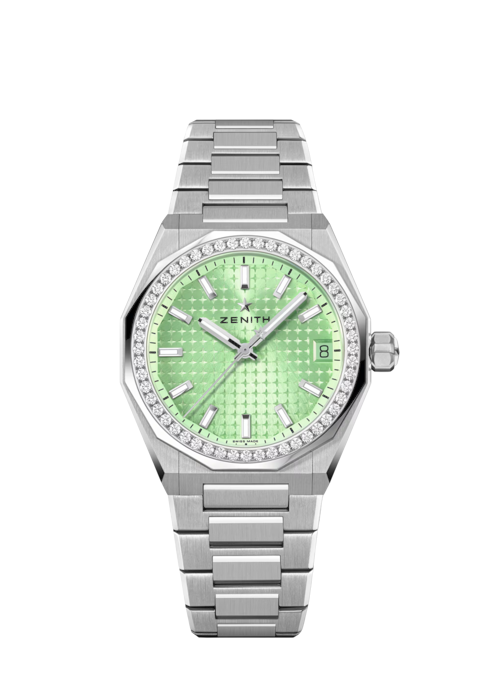 The DEFY Skyline watch with its 36mm steel octagonal case and faceted diamond-studded bezel is distinguished by its metallic pastel green “Soleil” effect dial, inspired by ZENITH's emblematic four-pointed star. Animated by the Elite 670 automatic manufacture movement. Interchangeable steel bracelet and green rubber strap with motif inspired by the iconic ZENITH star.