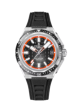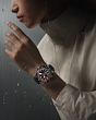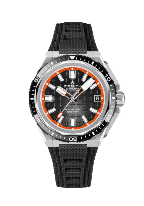The DEFY Extreme Diver with a 42.5 mm angular titanium case features a black ceramic rotating bezel and helium escape valve with water resistance of 60 ATM (600 meters). It features a black dial with a star pattern and luminescent hour markers and hands. Powered by the El Primero 3620 SC automatic movement with 60-hour power reserve. Interchangeable strap system with titanium bracelet, rubber strap and one-piece fabric strap made from recycled fishing nets.