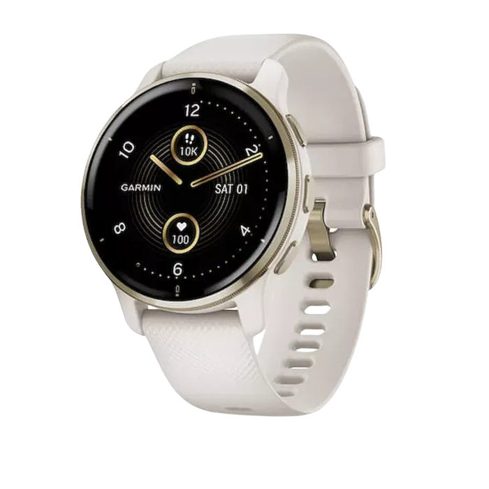 Orologio Garmin Venu2 Plus Lunetta Cream Gold Stainless Steel con cassa powder Ivory di 43 mm e cinturino in silicone avorio, con luminoso schermo AMOLED con batteria con durata fino a 9 giorni, con funzioni avanzate di monitoraggio della salute e fitness che ti consentono di comprendere al meglio ciò che accade nel tuo corpo, e con la comodità di effettuare e ricevere chiamate.