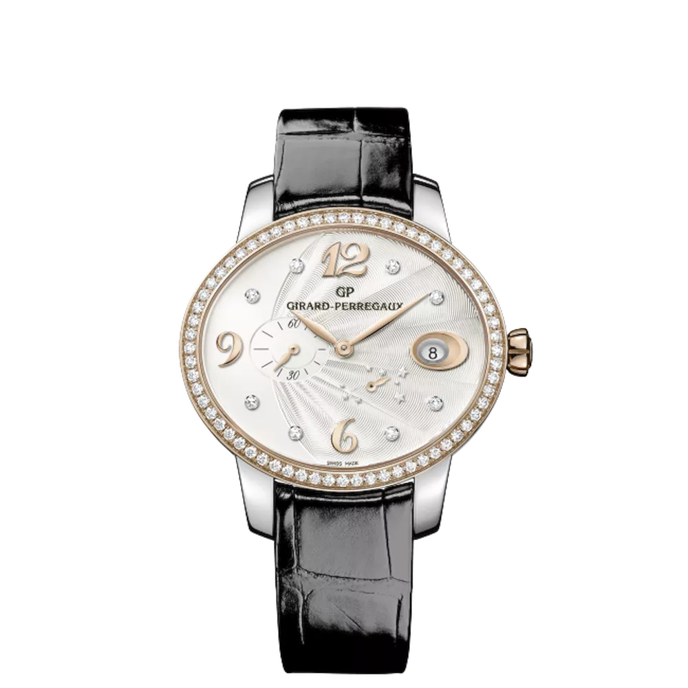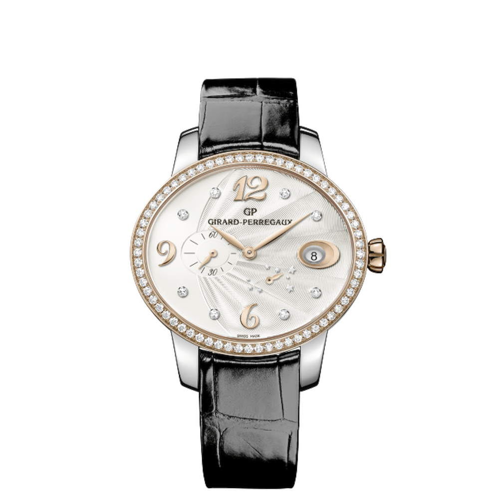 Dettagli e funzioni tradizionali come la visualizzazione della data e l'indicatore della riserva di carica rispecchiano la forma della cassa, con una corona lucida integrata a forma di fiore.