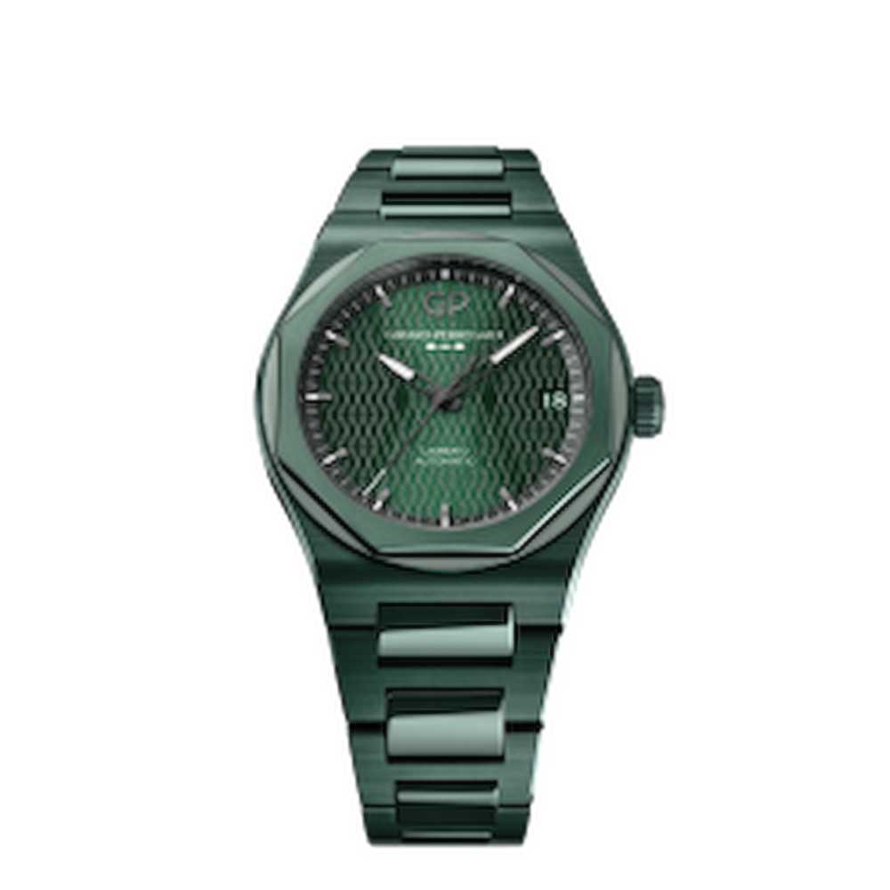 Entrambe le versioni del Laureato Green Ceramic Aston Martin Edition sono dotate di una cassa slanciata. I componenti in ceramica verde sono particolarmente duri, fino a sette volte più duri dell'acciaio, e presentano una incredibile resistenza ai graffi, qualità che ne conserva per anni l'aspetto originario. Un'altra caratteristica dei componenti in ceramica verde è che non invecchiano né sbiadiscono con il passare del tempo. Inoltre, la ceramica non subisce gli influssi del cambiamento della temperatura ambiente, è leggera, ipoallergenica e incredibilmente liscia, tutti fattori che contribuiscono al suo comfort al polso. Raffinato, contemporaneo e molto elegante, il design del Laureato Green Ceramic Aston Martin Edition mostra alcuni elementi ispirati alle auto Aston Martin. Potenti motori, linee eleganti e leggerezza sono doti che caratterizzano i prodotti dell'azienda britannica. È quest'ultima caratteristica che ha indotto Girard-Perregaux a dotare il nuovo modello di lancette di ore e minuti scheletrate 'a bastone', leggere e funzionali. Il quadrante dell'orologio ha un design retinato, un motivo a losanga che si ritrova sul logo ‘AM’ (1921-1926) e sui sedili trapuntati di alcuni dei veicoli ad alte prestazioni del brand.