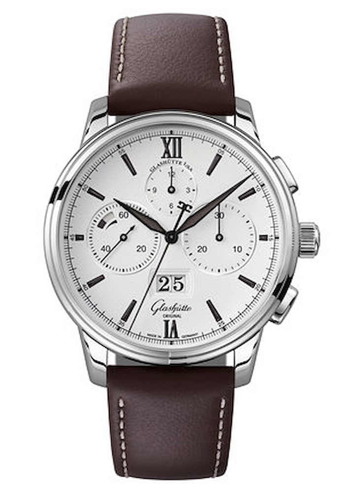 cronografo con visualizzatore dei 12 minuti, compteur 30 minutes, lancetta cronografica, meccanismo flyback indicatore della riserva di carica piccoli secondi (decentrati) arresto dei secondi Data Panoramica ore e minuti (centrali). Quadrante a vernice bianco, opaca, cifre romane/indicatori delle ore, parzialmente arricchito con inserti in Superluminova, cifre arabe/contorno ad anello
