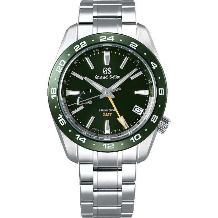 Dotato di una lancetta GMT, questo modello unico presenta il calibro con carica a molla esclusivo di Grand Seiko, che combina la forza motrice di una molla principale con l’elevata precisione di un orologio al quarzo. Alloggiato in una cassa di acciaio inox resistente all’acqua con lunetta di ceramica, lancetta GMT delle 24 ore e indici in Lumibrite per una leggibilità e precisione davvero eccezionali, è completato dal movimento di scorrimento fluido Spring Drive.