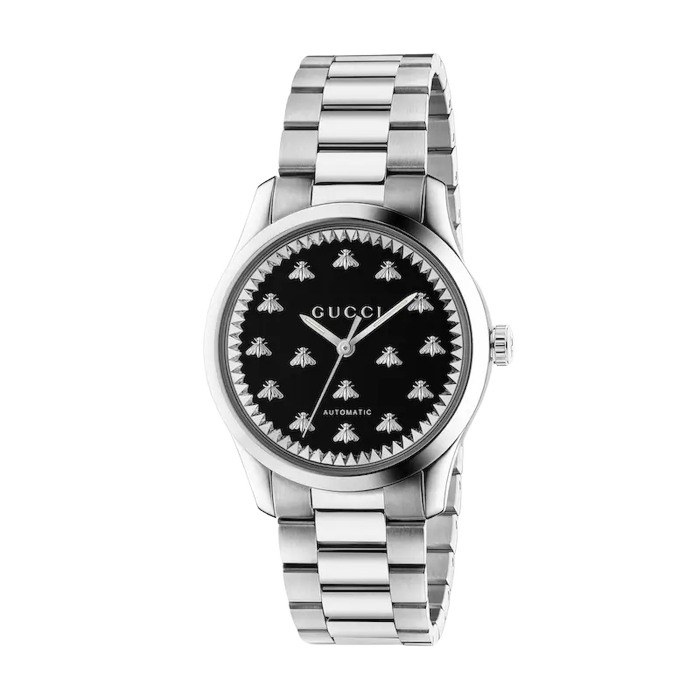 Parte della collezione G-Timeless, questo orologio automatico ha un quadrante nero in onice, impreziosito da lancette color argento che prendono la forma dell'ape, uno storico codice della Maison. Cassa e bracciale in acciaio completano l'accessorio.