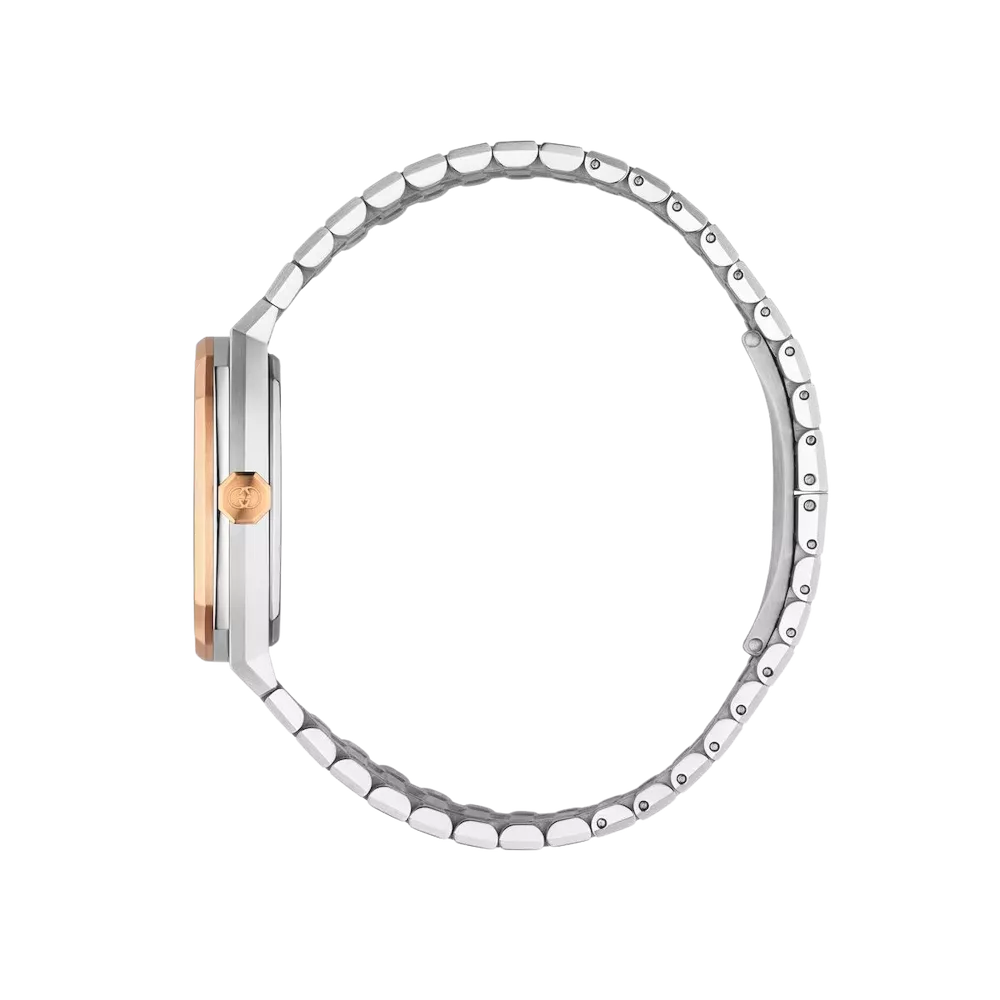 La nuova collezione GUCCI 25H presenta una silhouette essenziale, con elementi raffinati che valorizzano l'elegante design degli orologi. Questo accessorio, alimentato da un movimento al quarzo, è definito da un bracciale intercambiabile in acciaio e una cassa in acciaio inox con lunetta tonalità oro rosa.