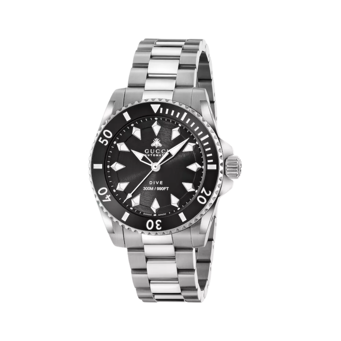 Contraddistinto dal suo design ispirato all'orologio da sub, qui il Gucci Dive si presenta con un quadrante nero con ape e bracciale in acciaio. Prendendo ispirazione dagli archivi, l'ultima collezione reinventa codici emblematici con uno spirito contemporaneo.